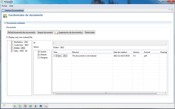 Vanilla Platform embeds a complete documents management runtime integrated with the other Vanilla components. Lucene technology is used as the backbone of the indexation. Options (available documents, real-time indexation and entries automatic creation) can be defined thanks to the Administrator module (Enterprise Services) of Vanilla. Norparena module is the place for documents management and manual indexation with a synthetic view on the documents. Indexed documents can be directly opened from the Vanilla Web Portal.